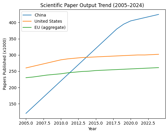 Data publikasi ilmiah global selama dua dekade terakhir memperlihatkan perubahan struktur yang jelas. Pada 2005, jumlah paper ilmiah China masih jauh tertinggal dari Amerika Serikat dan Uni Eropa. Namun sejak awal 2010-an, grafiknya menanjak tajam. Sekitar 2014–2015, China menyalip Amerika Serikat dalam jumlah publikasi ilmiah tahunan. Setelah itu, jarak tidak menyempit—justru melebar.
